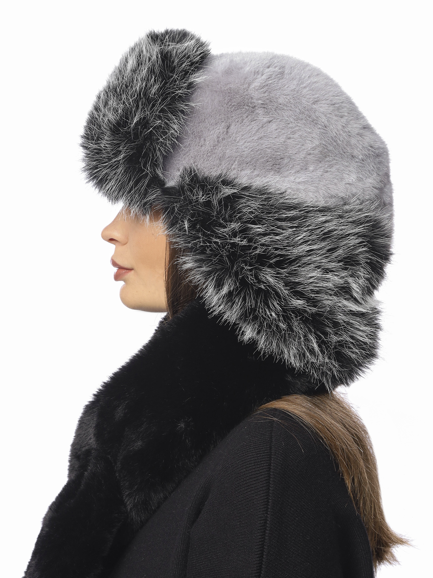 Шапка дополнена специальным ремешком, который может фиксироваться в трех положениях: сзади, под подбородком или вы можете носить шапку с расстегнутыми ушками. Верх ушанки выполнен из светло-серого экомеха «под кролика», а отворот и ушки – из пушистого двухцветного экомеха «под песца».