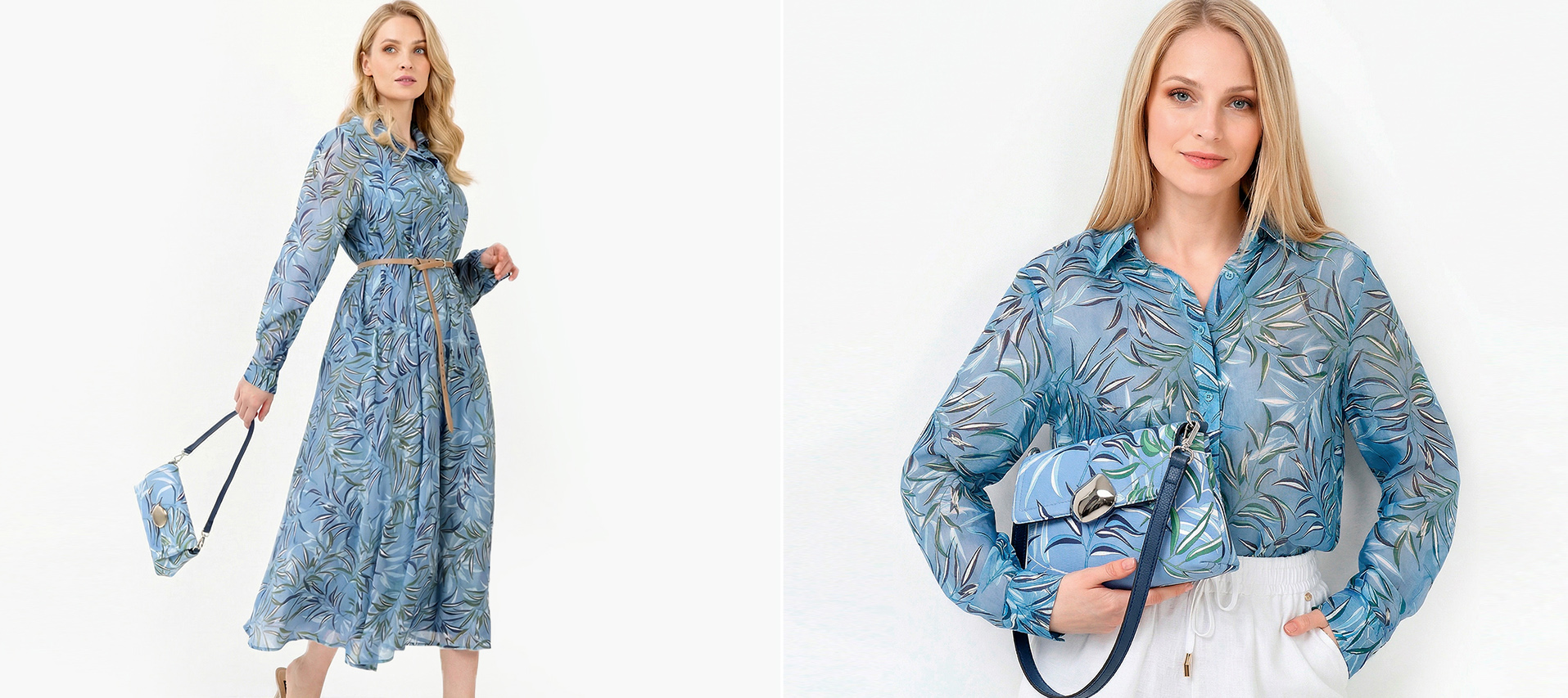 Дизайнеры FABRETTI предложили принт «листья» на нежно-голубом фоне, вдохновляясь цветом неба!