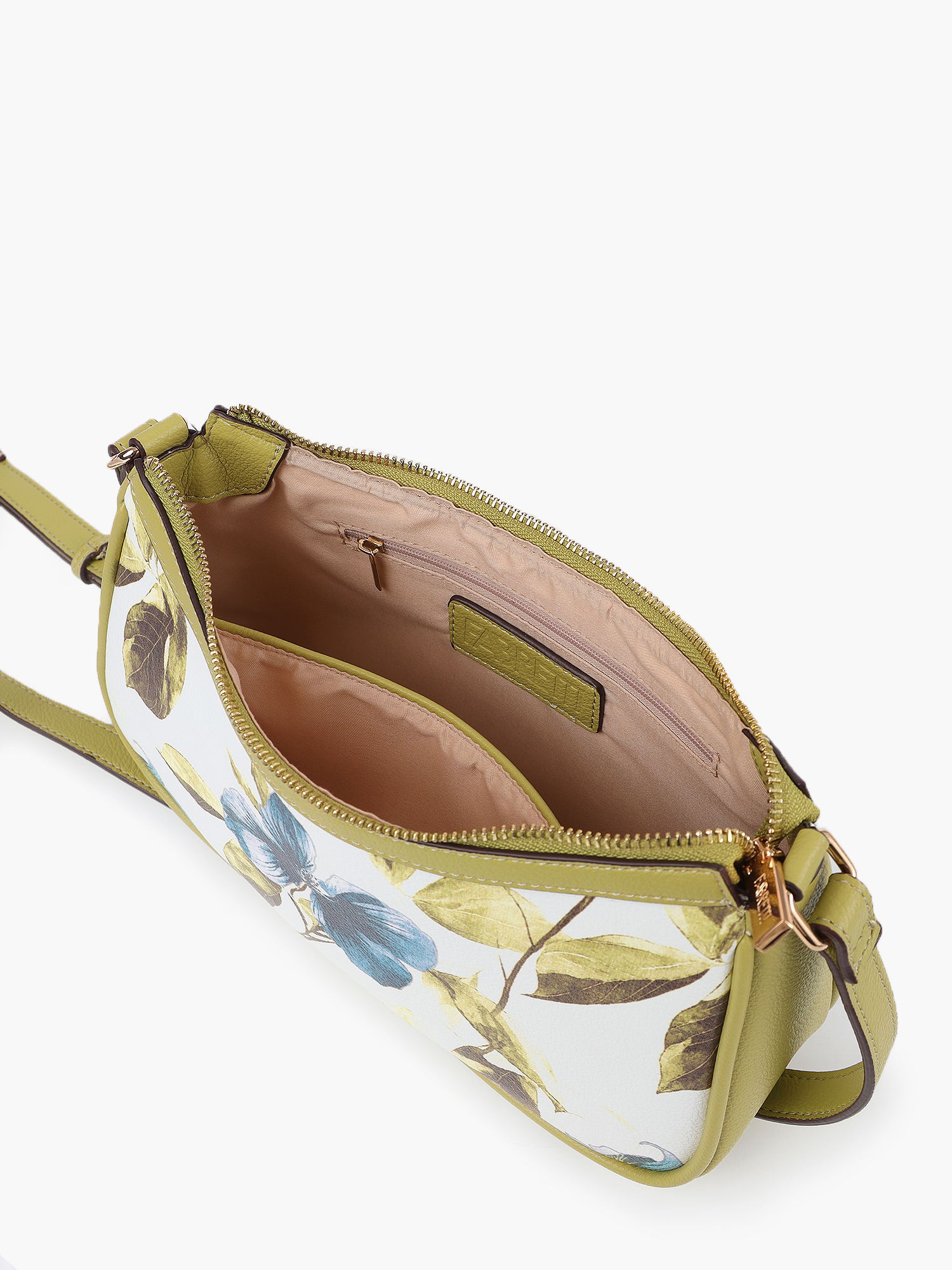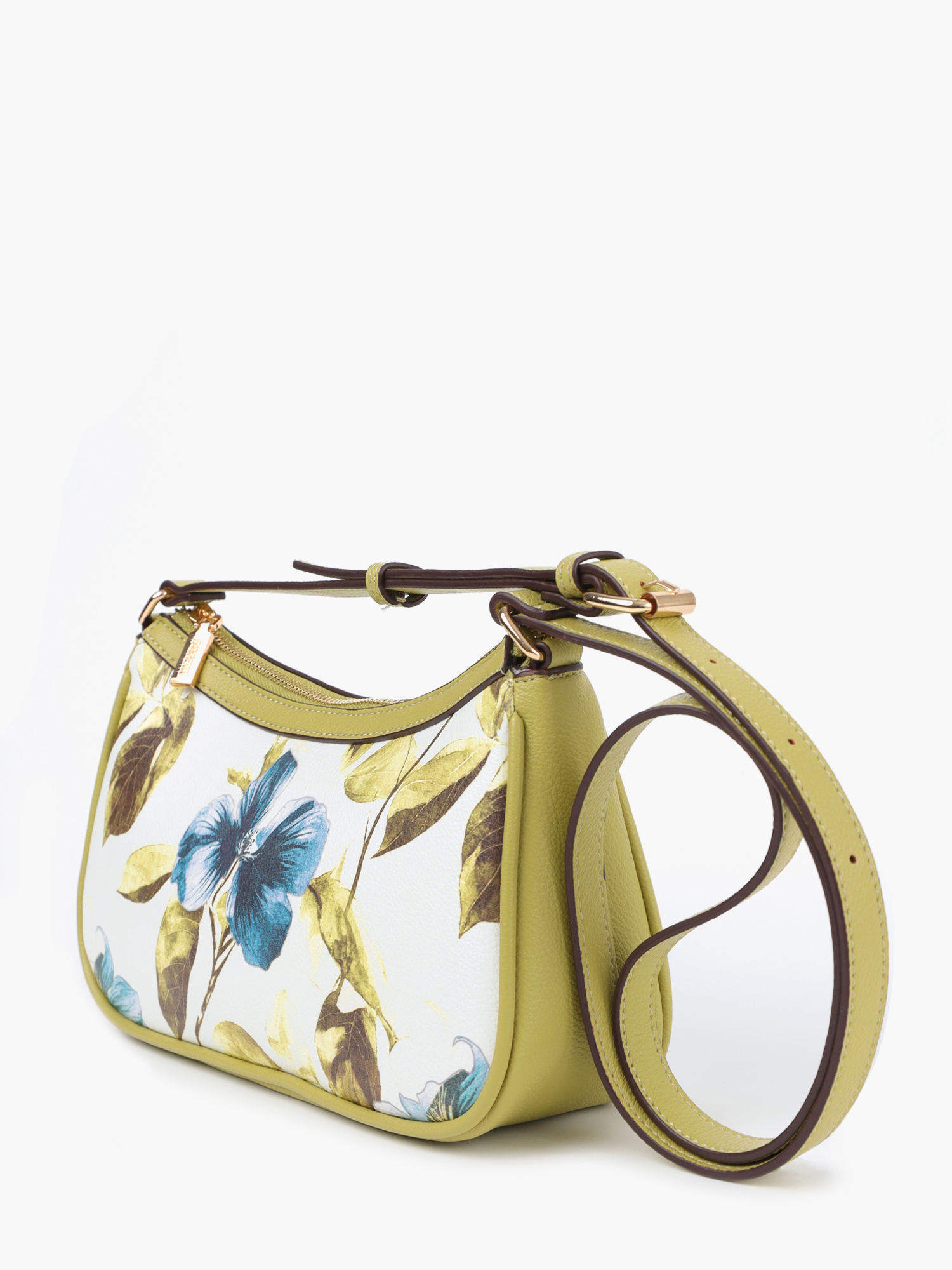 У сумки одно отделение на молнии, внутри открытый карман и на молнии. Модель украшена узором из пастельных голубых цветов и листьев. Плечевой ремень регулируется по длине пряжкой.