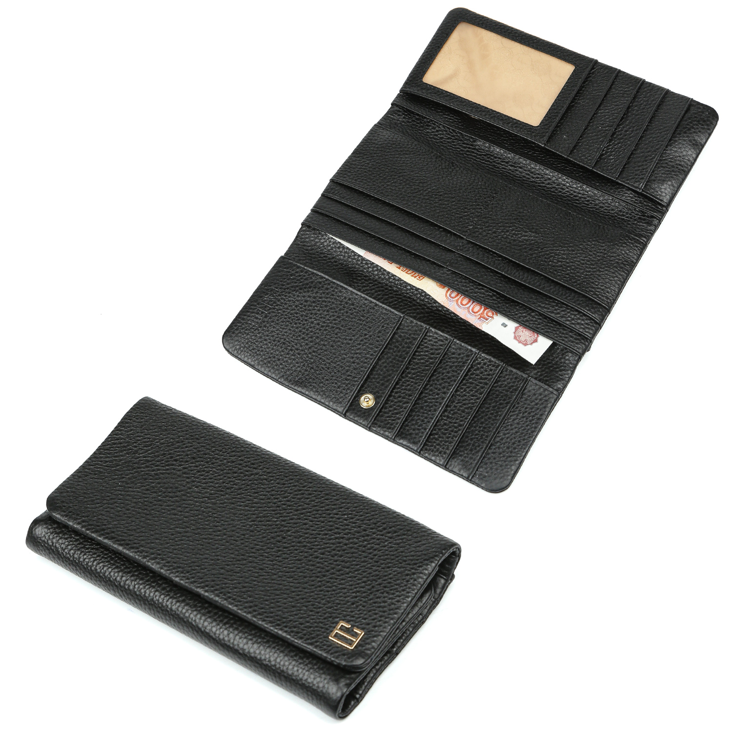 Аксессуар закрывается клапаном с кнопкой и сконструирован по типу книжки. Внутри 3 отделения на полную купюру, 1 вместительный открытый карман, 17 слотов для хранения банковских карт, 1 из которых - с прозрачной вставкой. На тыльной стороне предусмотрен карман быстрого доступа на молнии. Цвет фурнитуры - золото.